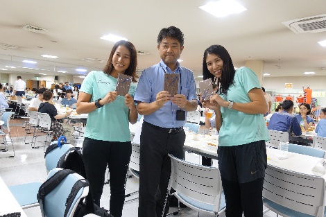 イベントでは「アスリートチーム」として本部長の立川さん、製造課課長の秀島さん、竜田さんと私のチームでフリースロー対決に挑戦しました。最初は緊張していましたが、会場からの拍手や声援に後押しされ、思いがけないミラクルショットが続きました。球技が得意ではない私ですが、皆さんの盛り上げにも助けられて優勝することができました!